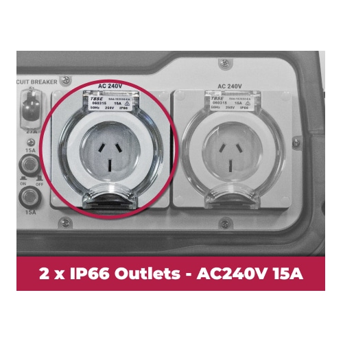 - 2 x IP66 Outlets (single phase – 15 Amp)