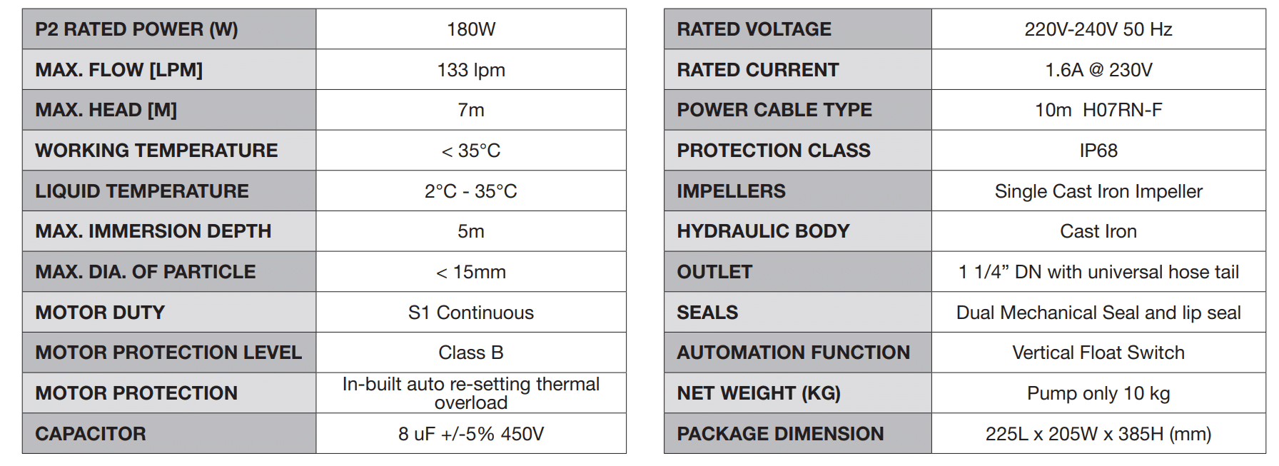 - 240V single phase motor with in-built thermal proception