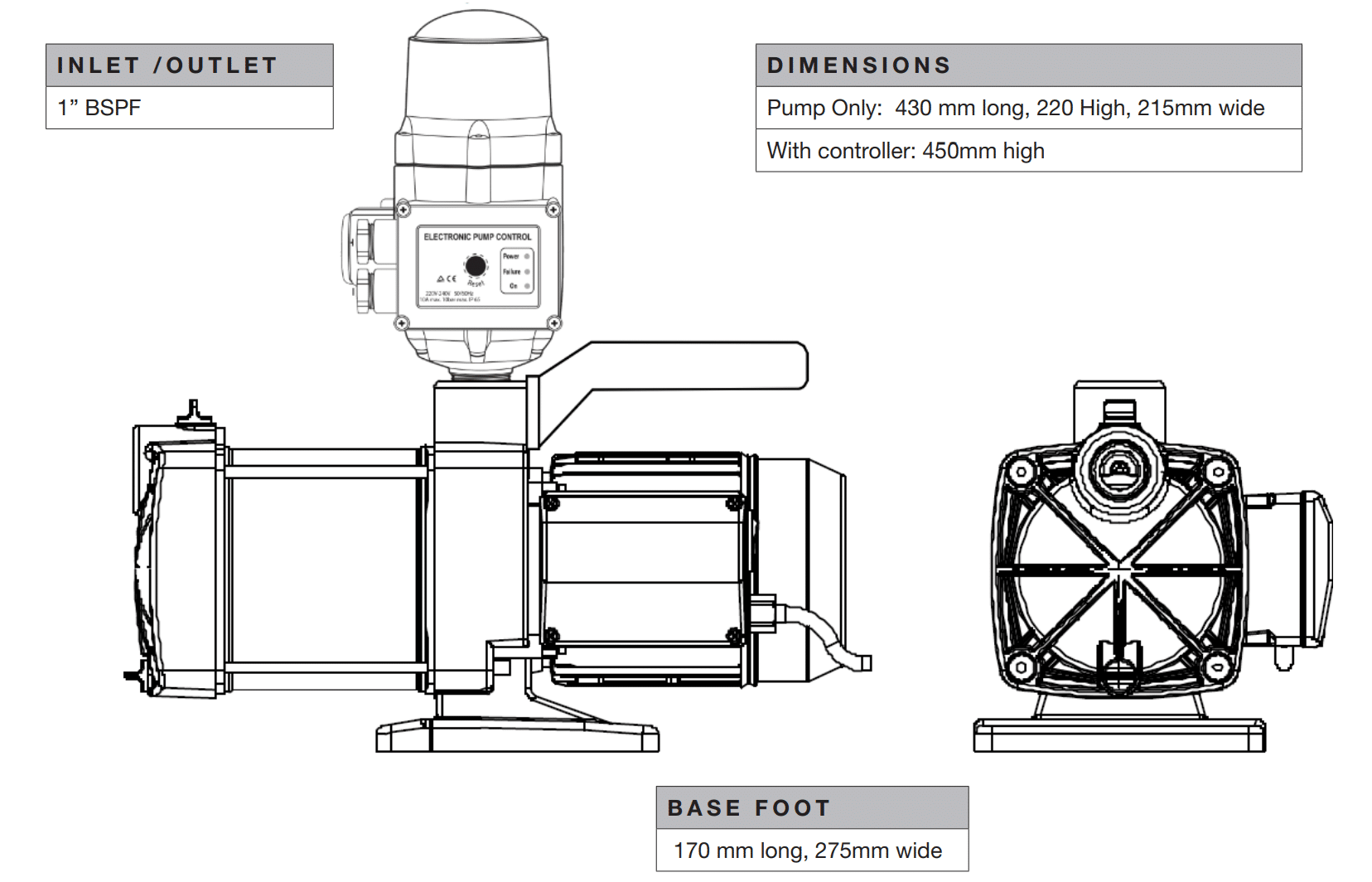 Self-priming pump with a quiet, reliable operation designed for larger homes. Automatic operation with a 24 hour restart to see whether there is water in the tank.
