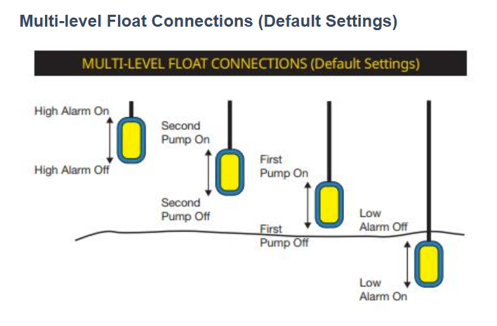 • System can be set to turn on all pumps in the event of a high level alarm; especially good in case the normal on/off floats are comprimised in some way