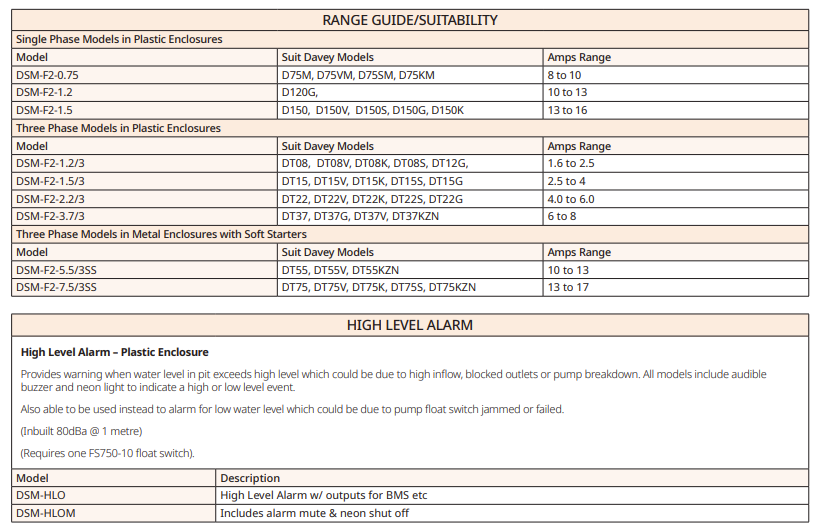 There are a large number individual models available with various options for different Davey sump pumps, please contact Davey directly, or search for a Dealer or Distributor to get assistance with choosing the most suitable model for your needs.
