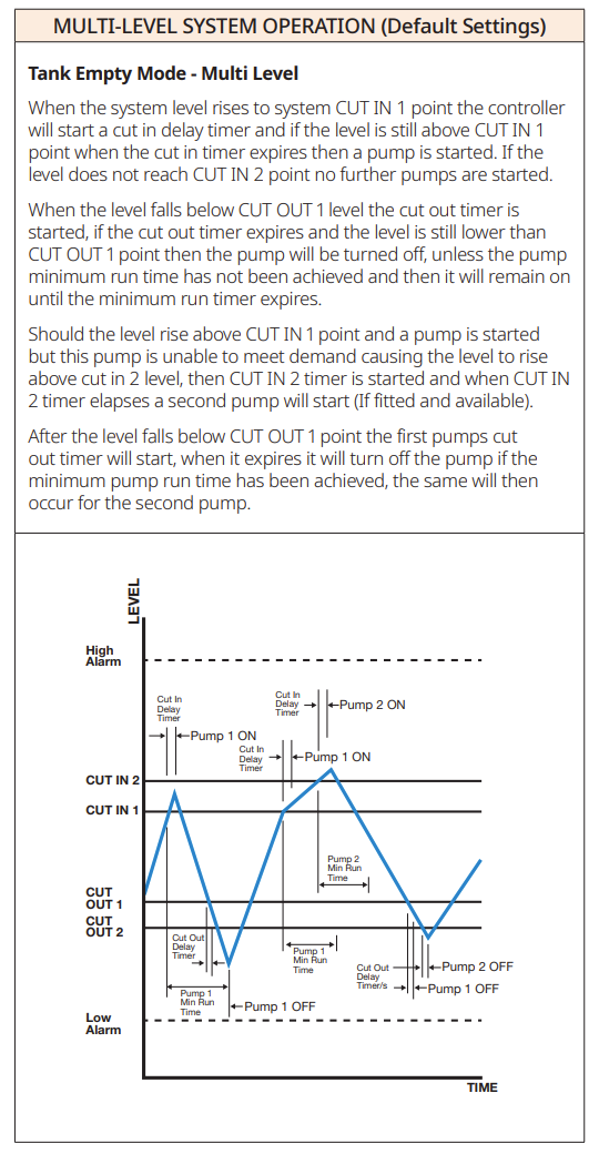 • System Protection includes adjustable high and low level shutdown settings with adjustable delay timers in order to protect pumps